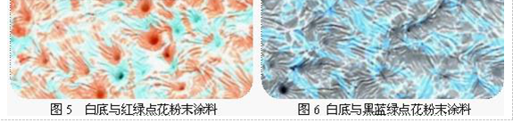 顯然,孔雀紋粉末涂料即是點花粉末涂料的變種或延伸,是由一種皺紋底粉與一種、兩種或兩種以上的點花粉混合而形成的。對于環(huán)氧型皺紋粉末涂料,經(jīng)應(yīng)用表明其無法實現(xiàn)孔雀紋的外觀效果,點花粉無法在環(huán)氧型皺紋粉末涂料中展現(xiàn)出其色彩效果。而在P/TMMGU皺紋粉末涂料中,點花粉的色彩展現(xiàn)與在錘紋或其它普通平面型粉末涂料中的展現(xiàn)性能相近或更好,因此能形成孔雀紋的粉末涂料外觀效果。由于底粉花紋的影響,P/TMMGU型孔雀紋效果與普通點花粉末涂料的花紋效果存在明顯的差別,更類似于孔雀羽毛的色彩效果。