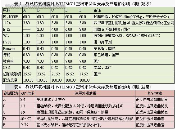 封閉異氰酸酯在P/TMMGU型皺紋、網(wǎng)紋、龜紋及孔雀紋中的已有廣泛的應(yīng)用,特別是在P/TMMGU型皺紋粉末涂料研制過程中除了調(diào)節(jié)反應(yīng)速度外,更能有效地減少“結(jié)點”這種不良現(xiàn)象或缺陷的發(fā)生。事實上,P/TMMGU型粉末涂料在胺封閉磺酸催化作用下,封閉型異氰酸酯并不是唯一對此類粉末涂料涂層表面起到調(diào)整作用。在實際應(yīng)用中發(fā)現(xiàn),環(huán)氧聚合物對P/TMMGU型網(wǎng)紋及龜紋粉末涂料更有花紋與光澤調(diào)節(jié)雙重作用,這種環(huán)氧聚合物有環(huán)氧樹脂、TGIC、PT910、912、GMA丙烯酸樹脂等,其中雙酚A環(huán)氧樹脂是這種應(yīng)用于粉末涂料中的典型代表。試驗配方如表5所示,測試結(jié)果見表6。測試的烘烤條件為200℃15分鐘。